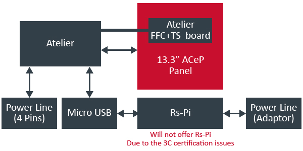 Atelier with an 13.3” E Ink Gallery Plus display (AC133UT1) demo kit allows E Ink clients to access the hardware and software of 13.3” E Ink Gallery Plus display module for evaluation. This kit is a turnkey solution for those who are interested in designing with E Ink displays. Hardware and software design support is available from E Ink directly.
